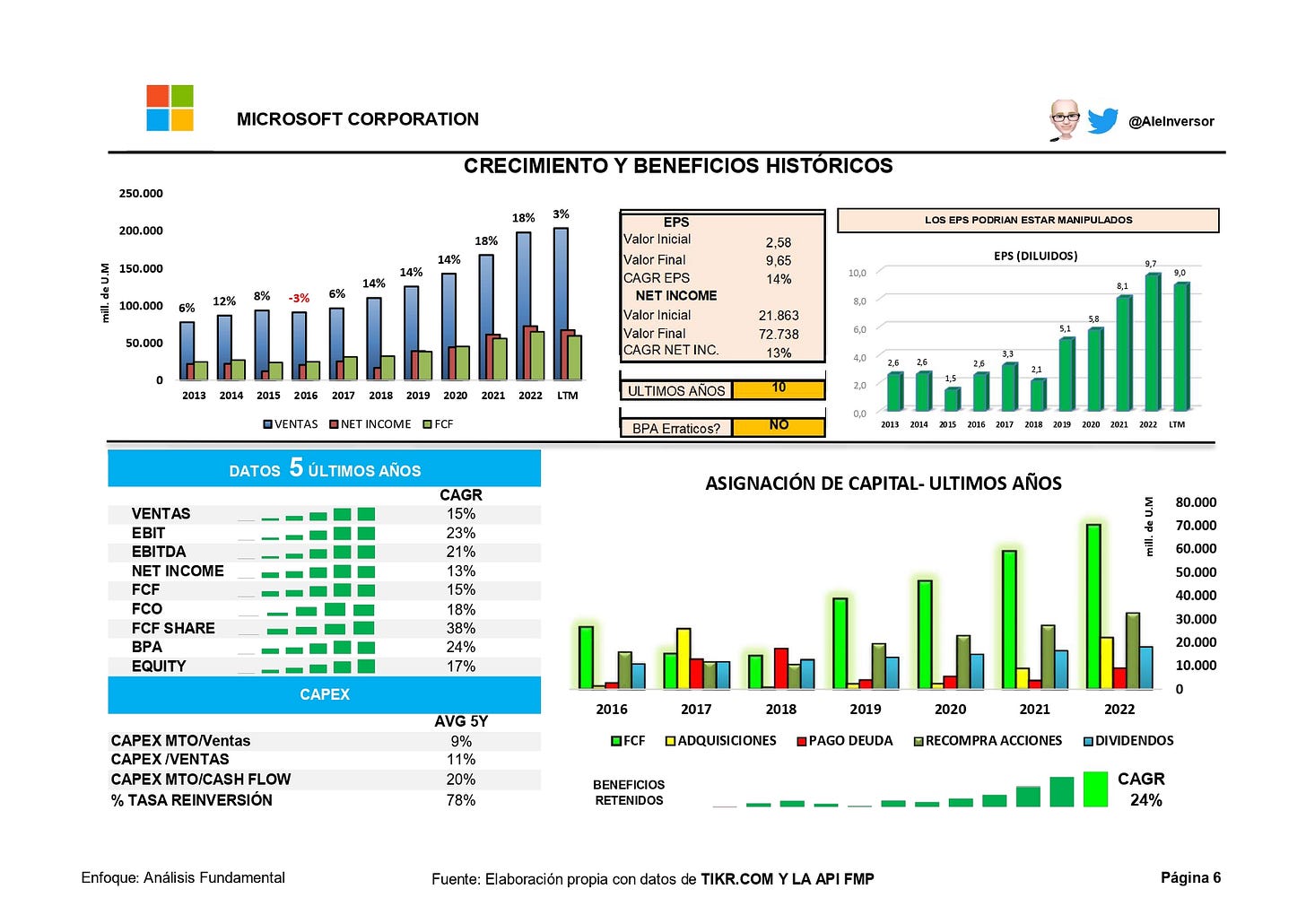 Aquí destacaría el rendimiento que han tenido los EPS superior al Precio de cotización por lo que siempre es buena señal de cara a futuros RE-RATINGS o expansión de múltiplo.