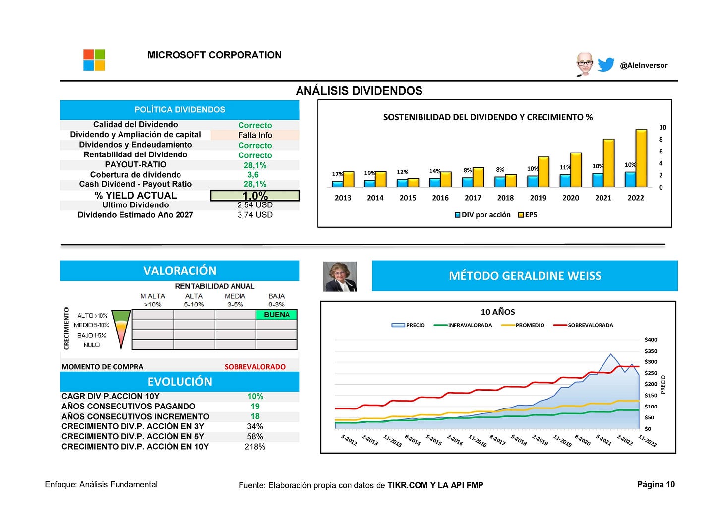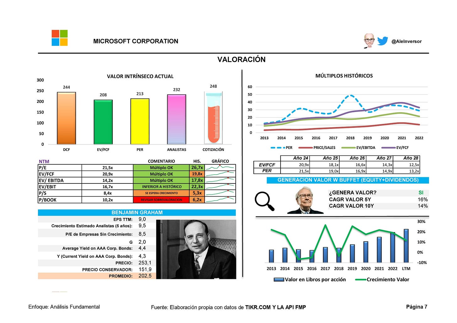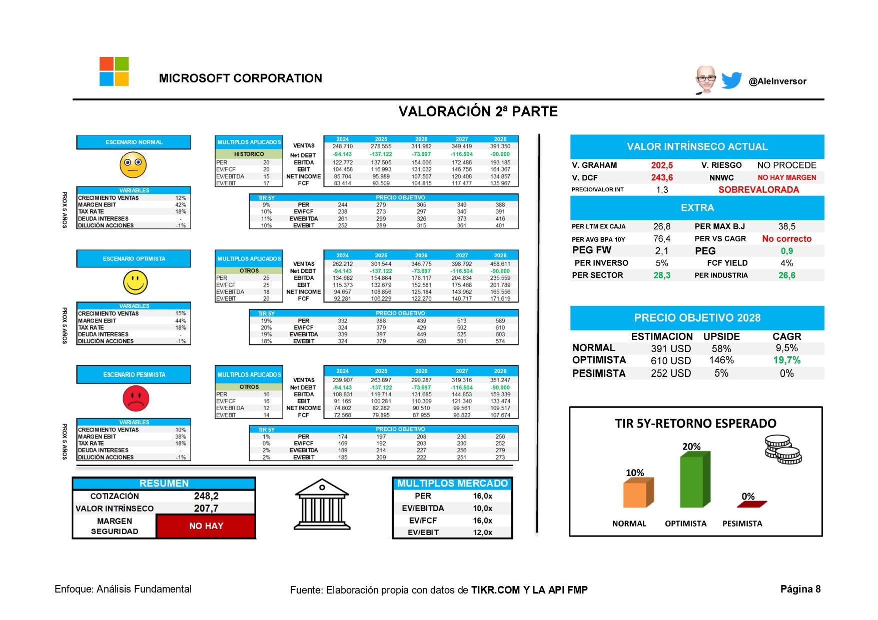 Centrándonos en la parte de valoración bajo mi punto de vista, la empresa estaría un poco sobrevalorada, estimo su FV sobre los 210 USD por lo que a día de hoy esperaría una bajada para poder aumentar posición en mi cartera.