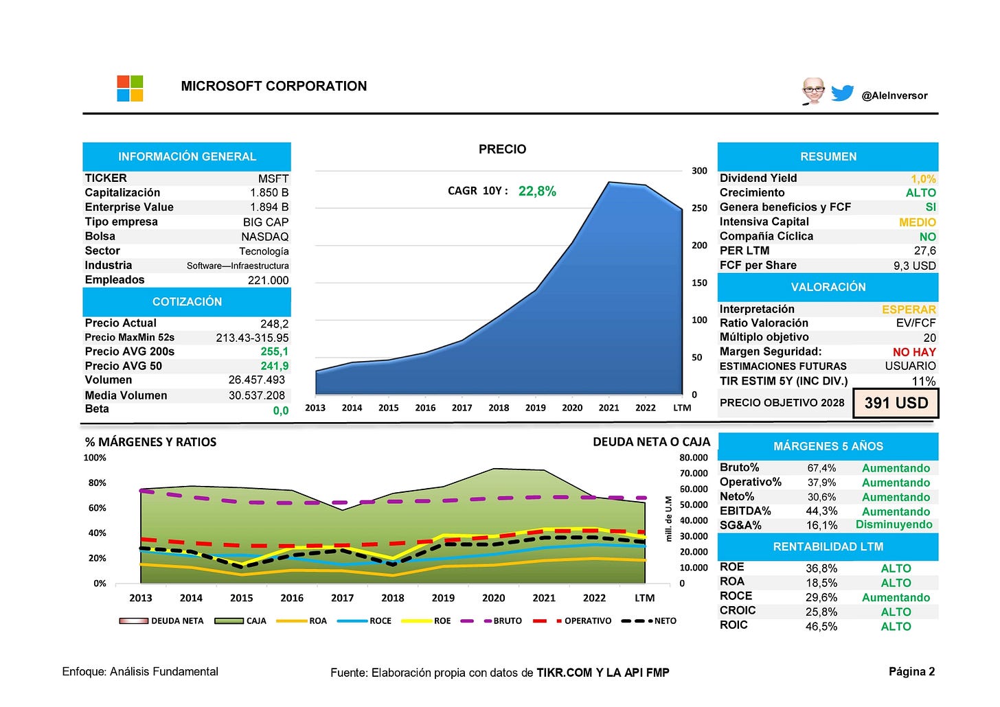 Actualmente cotiza a 248 USD a unas 20-25 veces FCF según se ajuste (un poco superior a su tasa de crecimiento) y según mis estimaciones la inversión presenta un riego medio con una TIR esperada de doble dígito en torno al 10-11% en un escenario conservador aplicando un múltiplo un poco acorde a la situación MACRO y con el escenario de Tipos que estamos sufriendo actualmente.