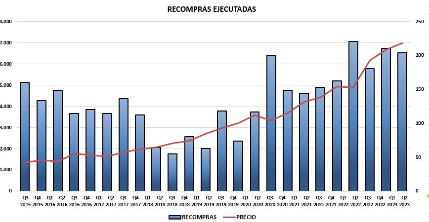 Aquí te dejo los gráficos de las últimas recompras hechas por la compañía. Aunque no han estado recomprando en máximos (observando por múltiplos) tampoco es que lo hayan hecho en los momentos donde la acción ha estado más barata bajos de cotización excepto en 2020 (pandemia)hay un trimestre donde ejecutaron correctamente, cabe recordar que si la recompra se hace a precios bajos es una creación de valor muy grande para el accionista.. Adjunto grafico.