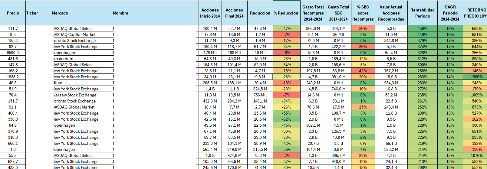 Recuerda que 📊 Esta tabla es una herramienta muy potente para analizar si una empresa ha generado valor real a través de recompras de acciones.