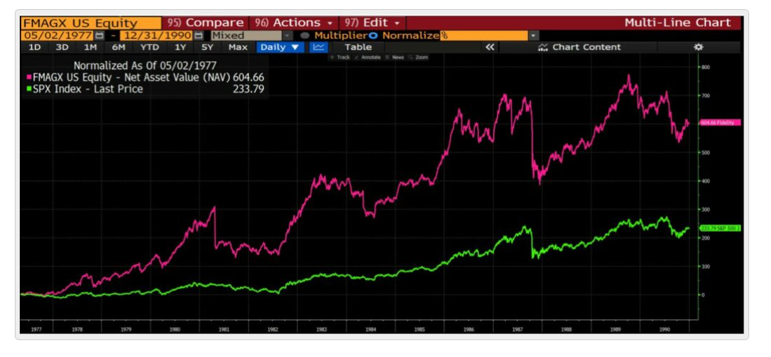 Gráfico comparando Fondo de P.Lynch (MAGELLAN) vs SP500 donde se ve claramente como destrozó al mercado..